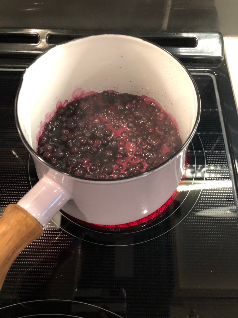 In a pot put at least a cup for four drinks of small frozen blueberries. If you purchased fresh organic, throw in the whole container. You will see how many you need based on how many people you’re serving.