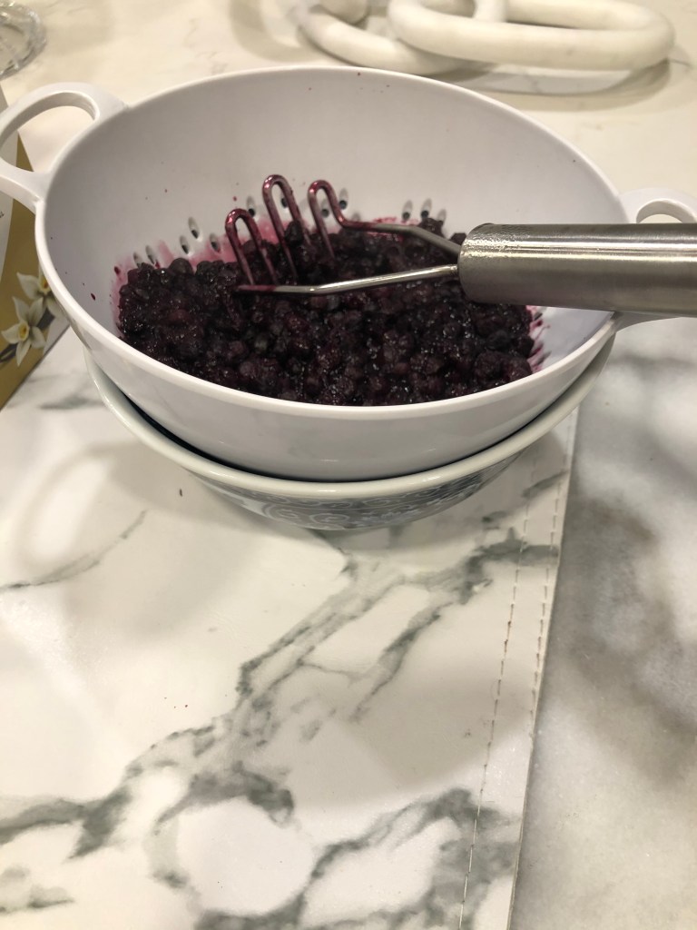 Place your strainer / collander over a bowl and empty the pot of blueberries.