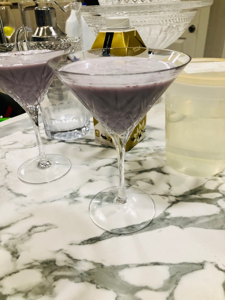 In your shaker, fill half with ice, add your two shots of vodka (one shot per drink – which is about what fits in a shaker), some of your simple syrup, some of your blueberry liquid, add your cream (we used roughly two tablespoons – one per drink) and we did use one splash of the extract.