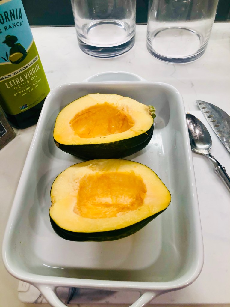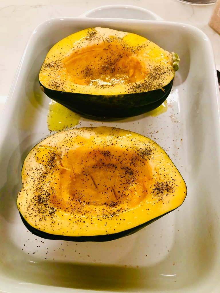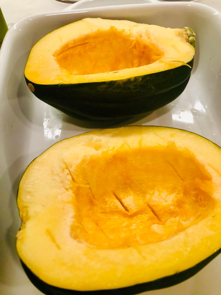 Take out the seeds and pulp and discard. Place the acorns in a casserole dish or on a baking sheet.
