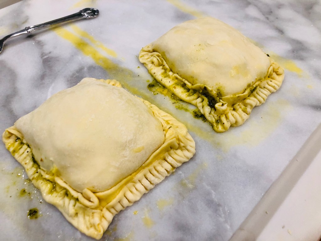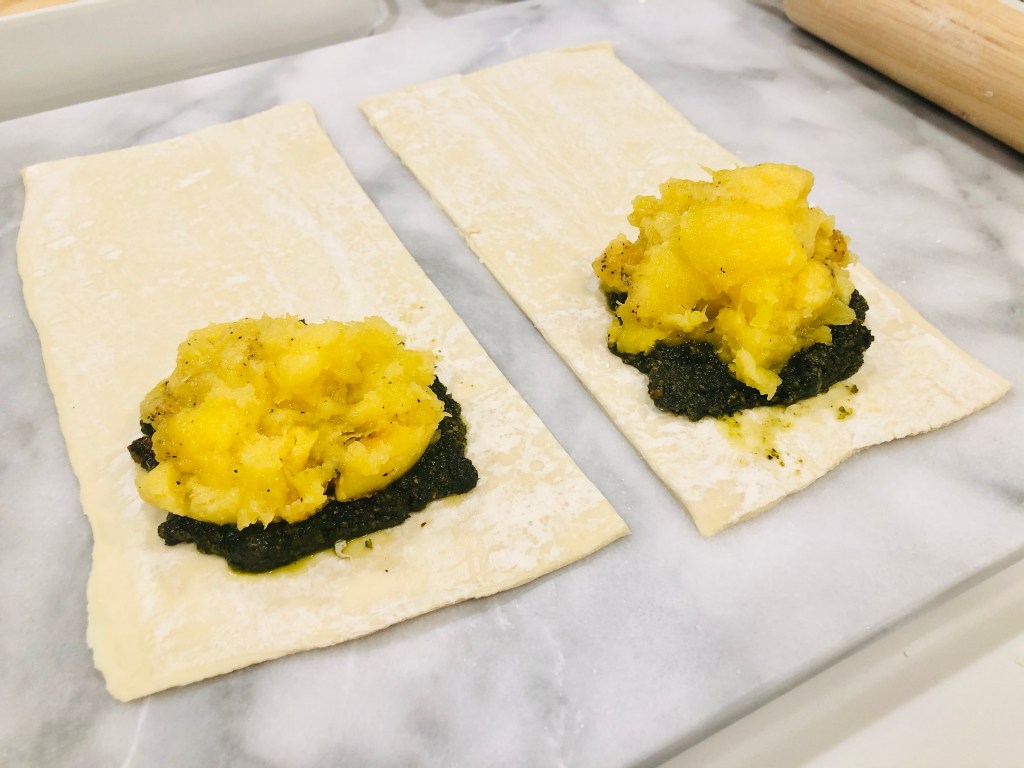 Take some of your pistachio pesto and plop it on each bottom end of the pastry (you’ll see where I got a bit close to the edge with the one on the right; I corrected that and pushed it back up. You need a definite edge for sealing later).
