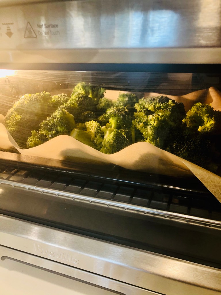 Next thing you’ll want to do is prep your broccoli to be roasted. Take your florets and pour them out on parchment paper or aluminum foil. Drizzle with the toasted sesame seed oil (or olive oil) – no need to stir them, and pop them frozen or fresh into the oven on 400 for 40 minutes when the squash is done. If you have room in your oven to do both the squash and the broccoli go ahead – otherwise, they can cook afterwards. You can prep the rest of the meal in the meantime.
