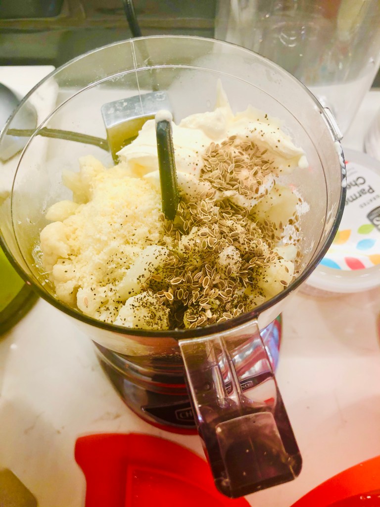 Your cauliflower can be now put in batches in your food processor or blender. You will add as much cauliflower as will fit (making sure they were fork tender first), topping with a tablespoon of fennel (I made these in two batches, a tablespoon a batch so make sure you use the amount appropriate for how many times you need to do this), two tablespoons of grated parmesan, some salt and pepper and two tablespoons of sour cream with a one count of olive oil. You may need more oil depending on how large the amount of food per batch you’re blending.