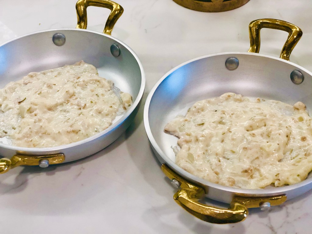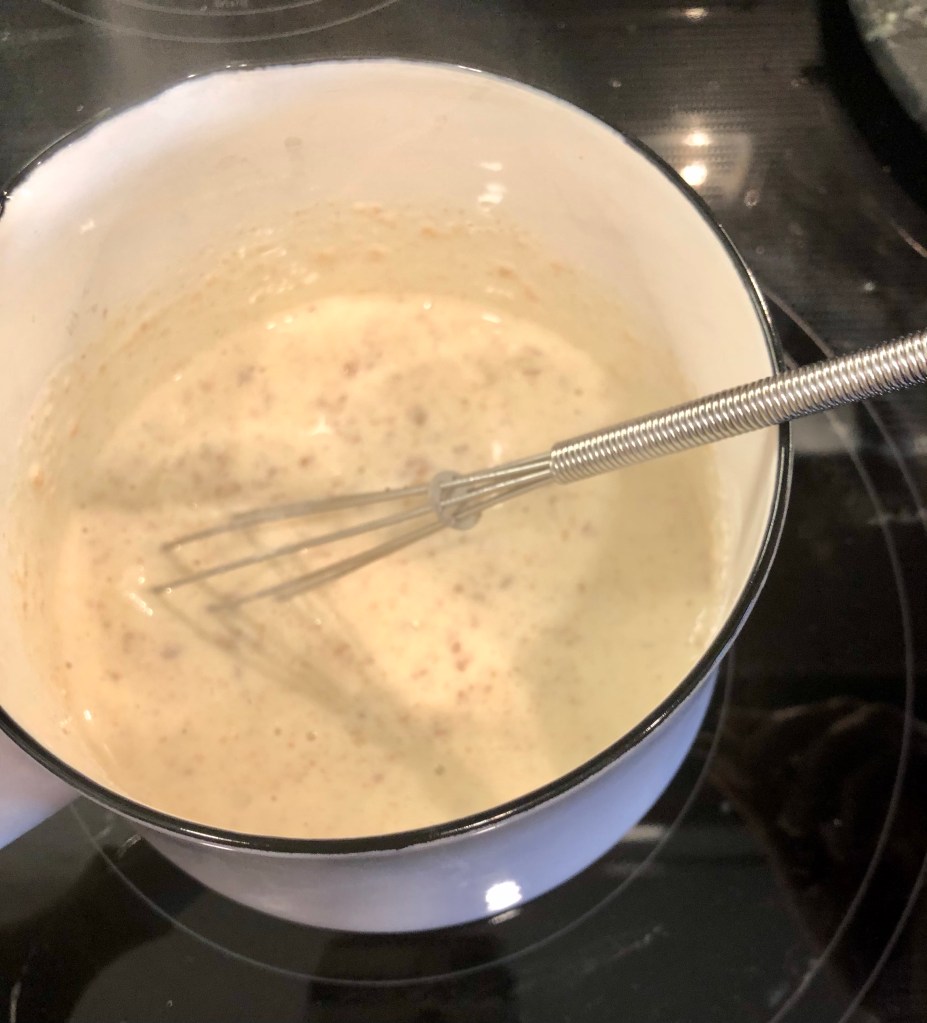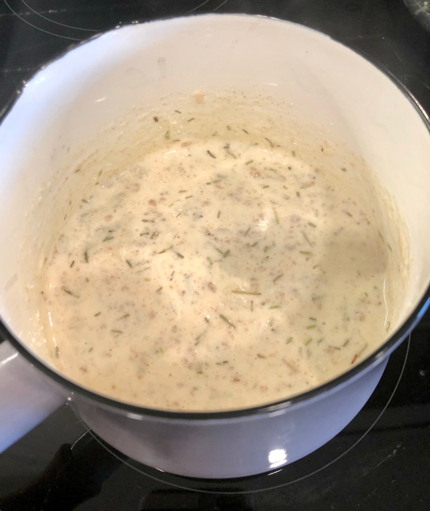 Whisk the flour and butter together, making sure the heat remains on medium / medium low. Then add a tablespoon of your dried rosemary (one tablespoon per two servings – adjust accordingly). Stir that in while adding a quarter cup of half and half / whipping cream (a quarter per two servings – adjust accordingly).