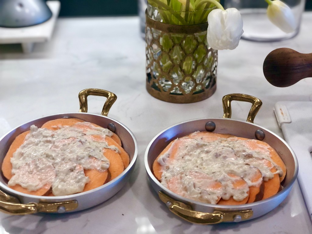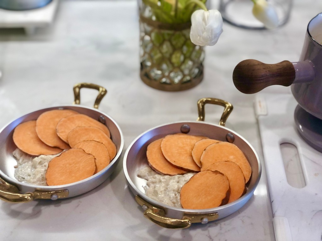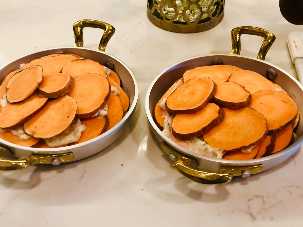Take your potatoes and slice them down into quarter inch pieces, layering them together so that if you’re using individual vessels like I am, each person will get the same amount of potatoes. If you’re cooking this in one large casserole dish, just cut your potatoes and set aside.