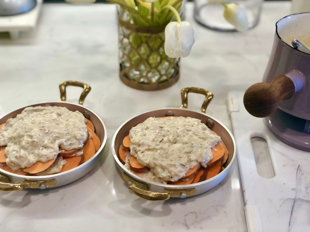 Then cover the potatoes with the sauce and spread just a bit (I will spread out on its own a bit once it heats in the oven).