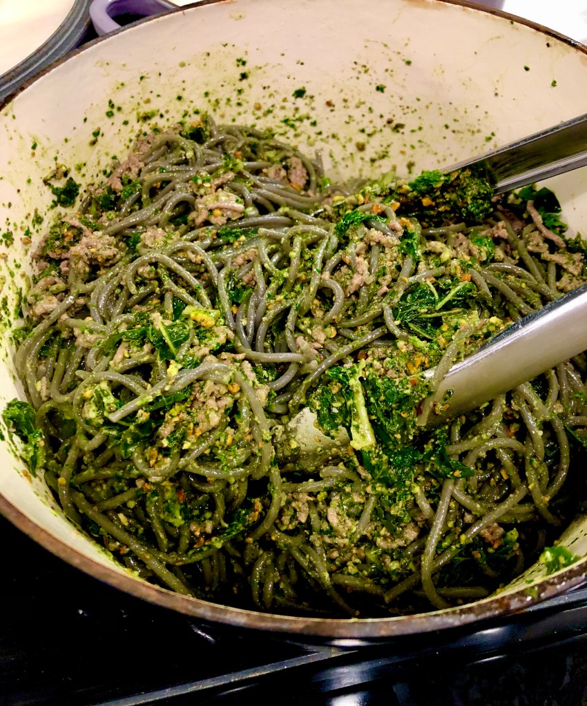 squid ink pasta with ground beef, kale and a pistachio pesto