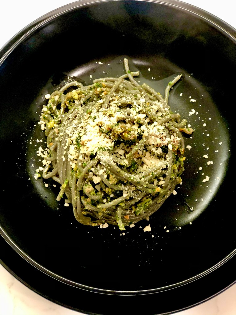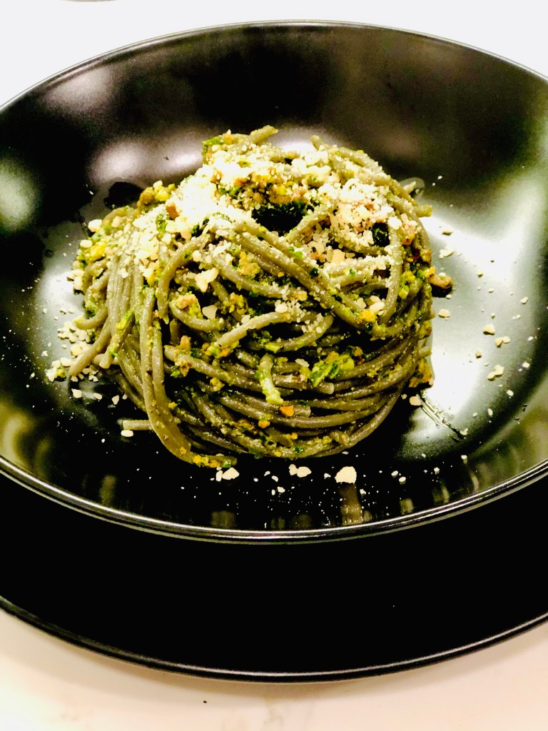 This pesto works so well against this flavor noodle. Squid Ink has a bit of a saltier taste to it and it requires something really strong to hold it up.