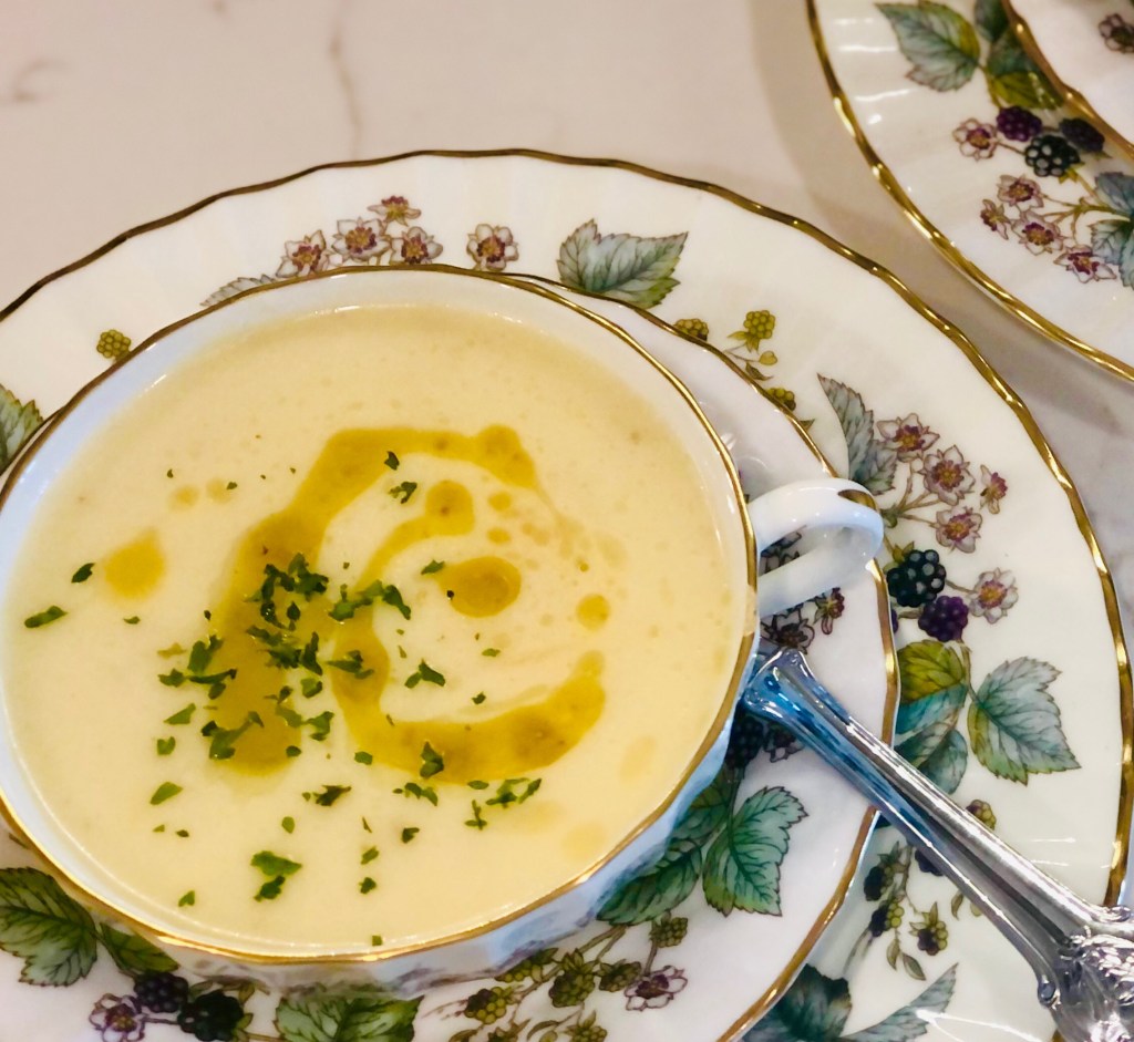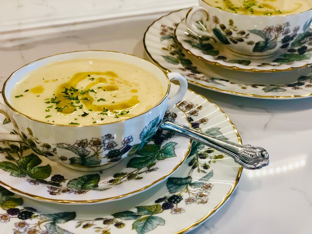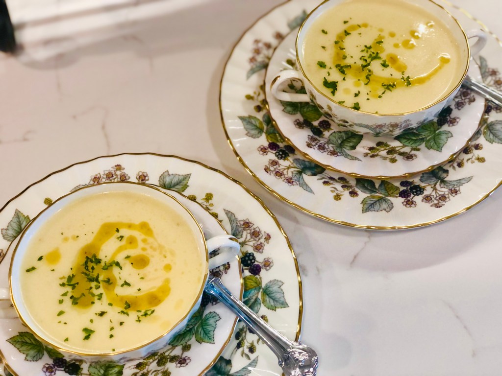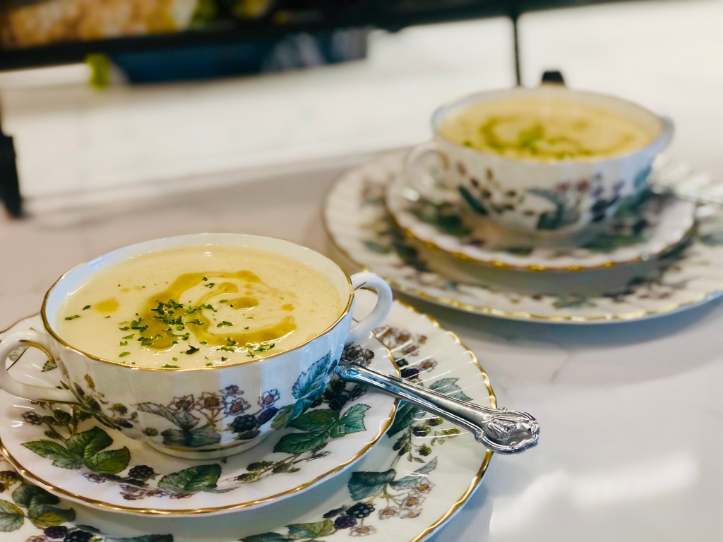 Take your blender, food processor or pot to use an emersion blender in and place your veggies and water (depending on how many people you’re feeding). Add your chicken broth instead of water if you chose that. Add your salt – starting small so you can always add. You can’t take salt away so… always start conservatively. Add a half a cup of the half and half (optional, can sub with cashews). Sounds like a lot but, it’s for the entire pot of veggies. One tablespoon of dried dill. Blend.
