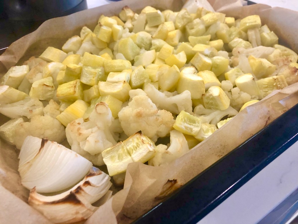I line a large baking sheet with parchment paper and plop my bag of frozen cauliflower florets onto it. Then, I take the medium / large sized summer squash and I peel them. Cutting them down to equal sized pieces I throw them on the baking sheet as well. Depending on how many people you are feeding, I measure 1 large / 2 medium squash per 1 bag of frozen cauliflower florets per 3 people. Taking the onion, cut it in a third and place that on the sheet too (1/3 an onion per 3 people – I cut my third of an onion into halves so the flesh is more exposed to the heating elements; I think it roasts better).
