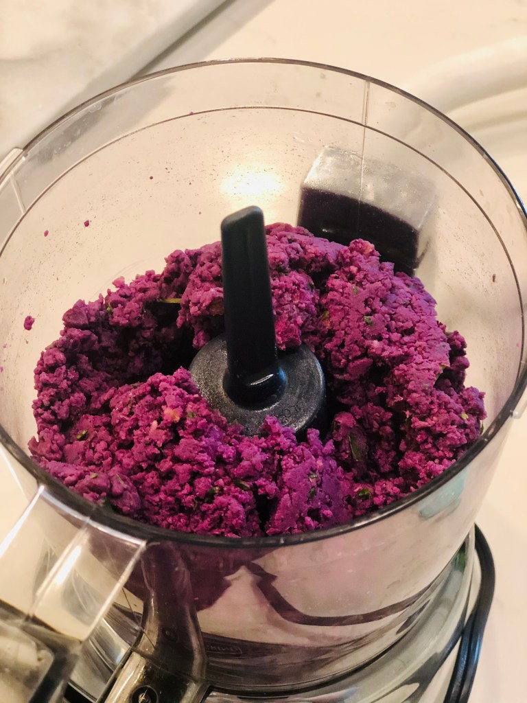 First thing you’ll want to do is get your potato steamed. I took one purple organic sweet potato and chopped it before steaming it.