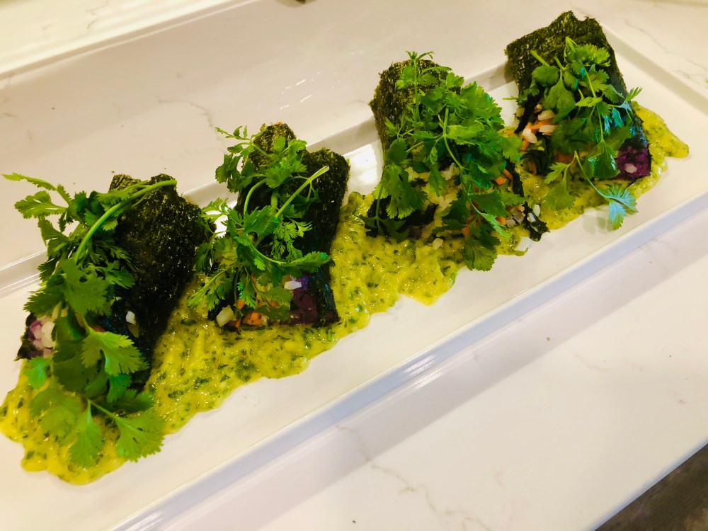 I then cut the rolls into four equal parts and laid them down across the plate. You can choose to put the sauce on the side or slice these into sushi sized bites.