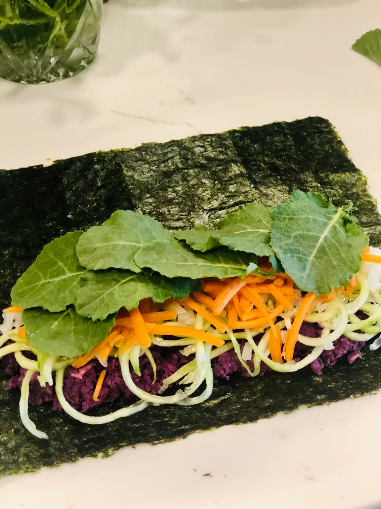 Break open your nori sheets and take one out. They’re a bit sticky and crumbly but it’s easy cleanup. Take scoops of your potato and start to line the sheets with the mixture going along the end all the way across. Like I had said earlier, I didn’t use an entire half of the mixture per sheet – there was some left over – go ahead an eat that separately or save.