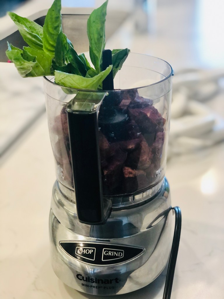 Your potato should be cool enough by now – go ahead and take all the pieces you cut and a nice stalk or two of fresh basil to your food processor and blend till combined.