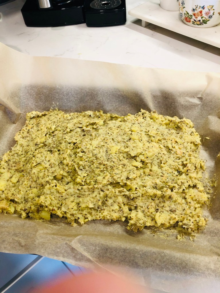 When you’re done creaming all the potatoes, smooth the mixture out across the parchment and make it as even as you can, with tight clean edges.