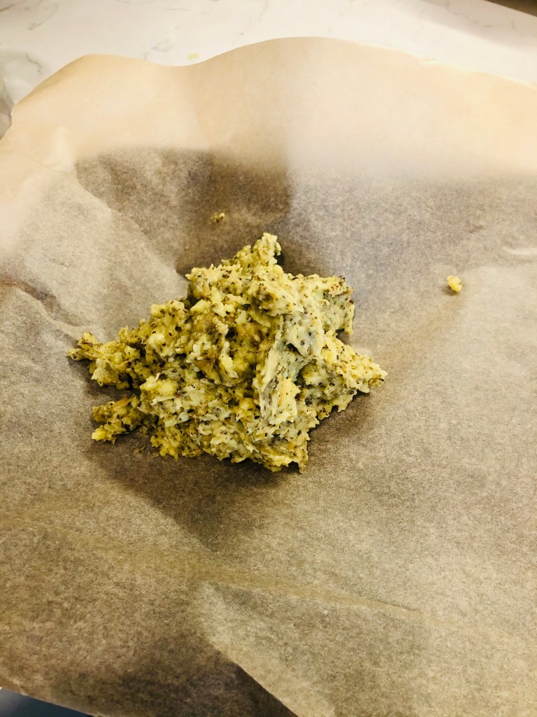 Take some parchment and lay it down on a cookie sheet, using a spatula (you can wet the spatula to make this easier), grab the creamed potatoes and plop them on the parchment.