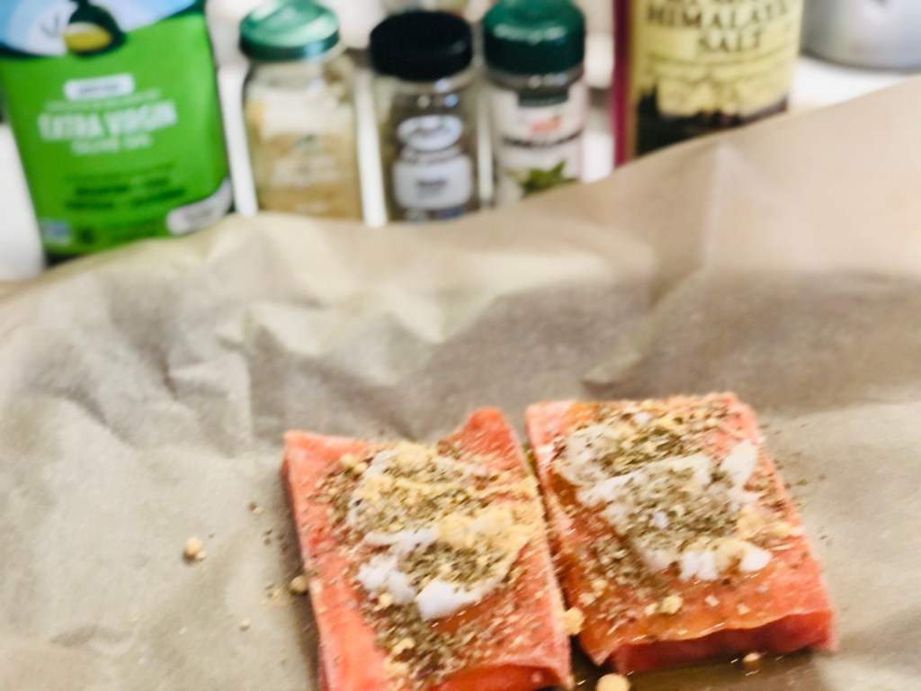 Set that aside and prep your salmon. Place a sheet of parchment down that is three – four times larger than the filets you are cooking. You’re trying to make a package with the parchment so it has to be able to close around the filets completely. Over the salmon pour some of the olive oil and then place some dried basil, ginger and oregano. Then take some of the coconut oil (about a tablespoon) and place that on top.