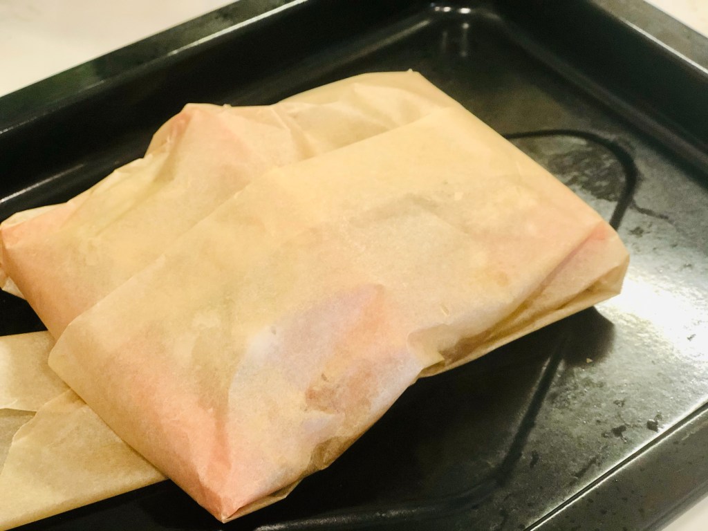 Take the salmon out and carefully unwrap the parchment.