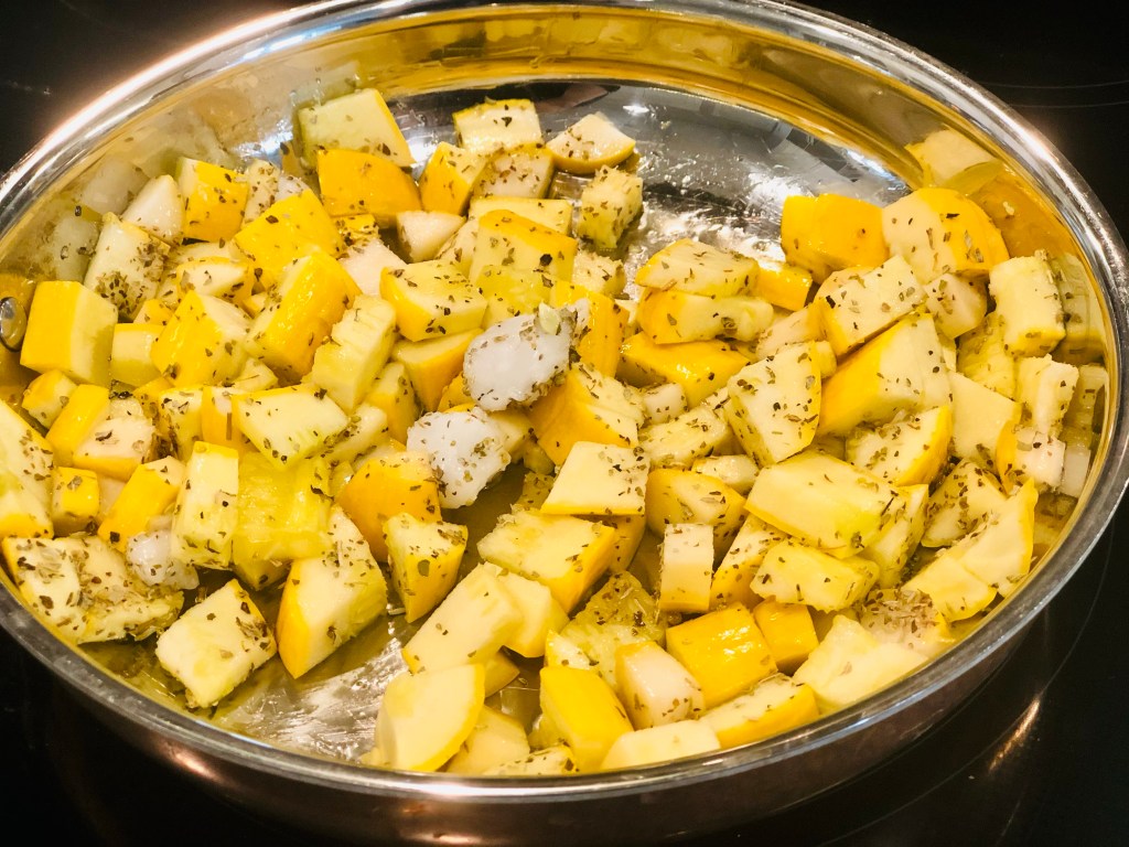 Cut the potatoes to the same size and steam them (unless you’d like to cook along with the squash in the same pan).