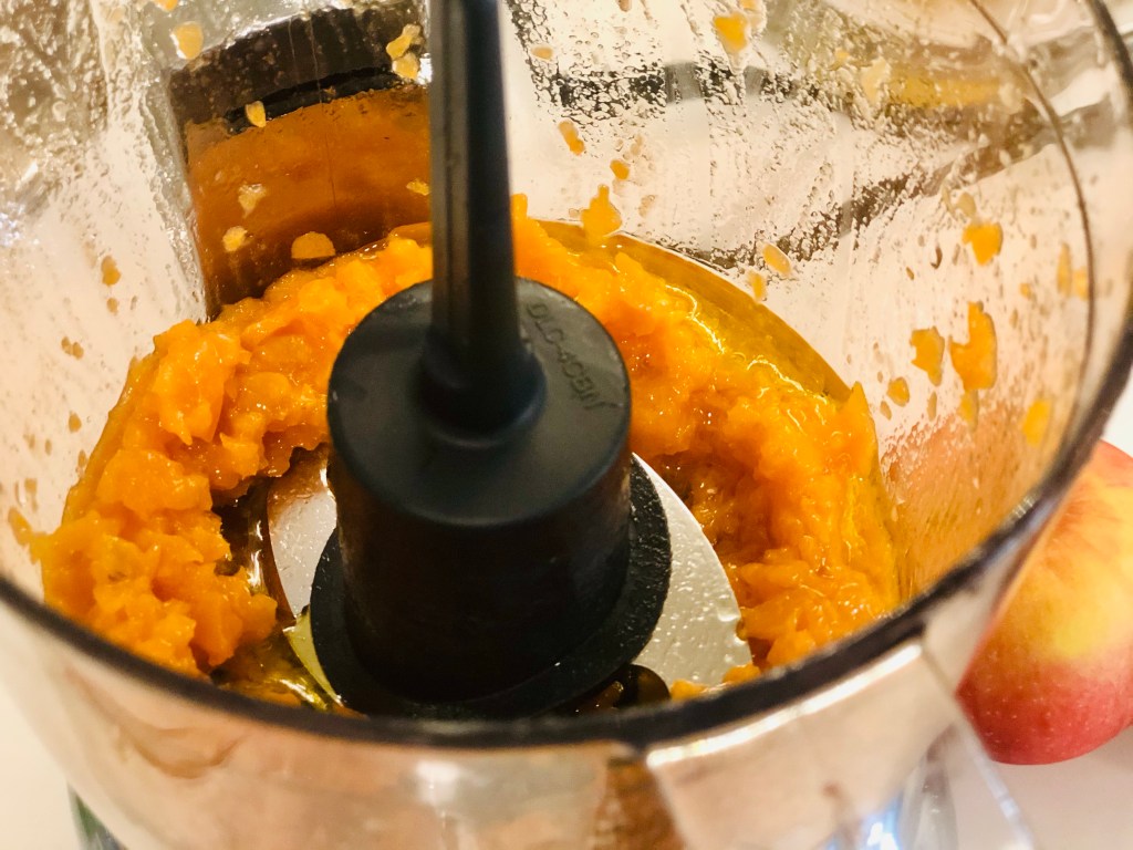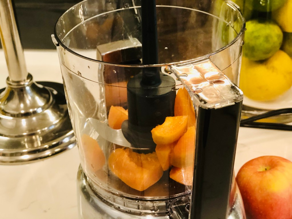 As the salmon finishes and the veg and potatoes stay on warm, take your apricots (I used two; one per person) and slice them down and place them into the food processor / blender discarding the pit(s).