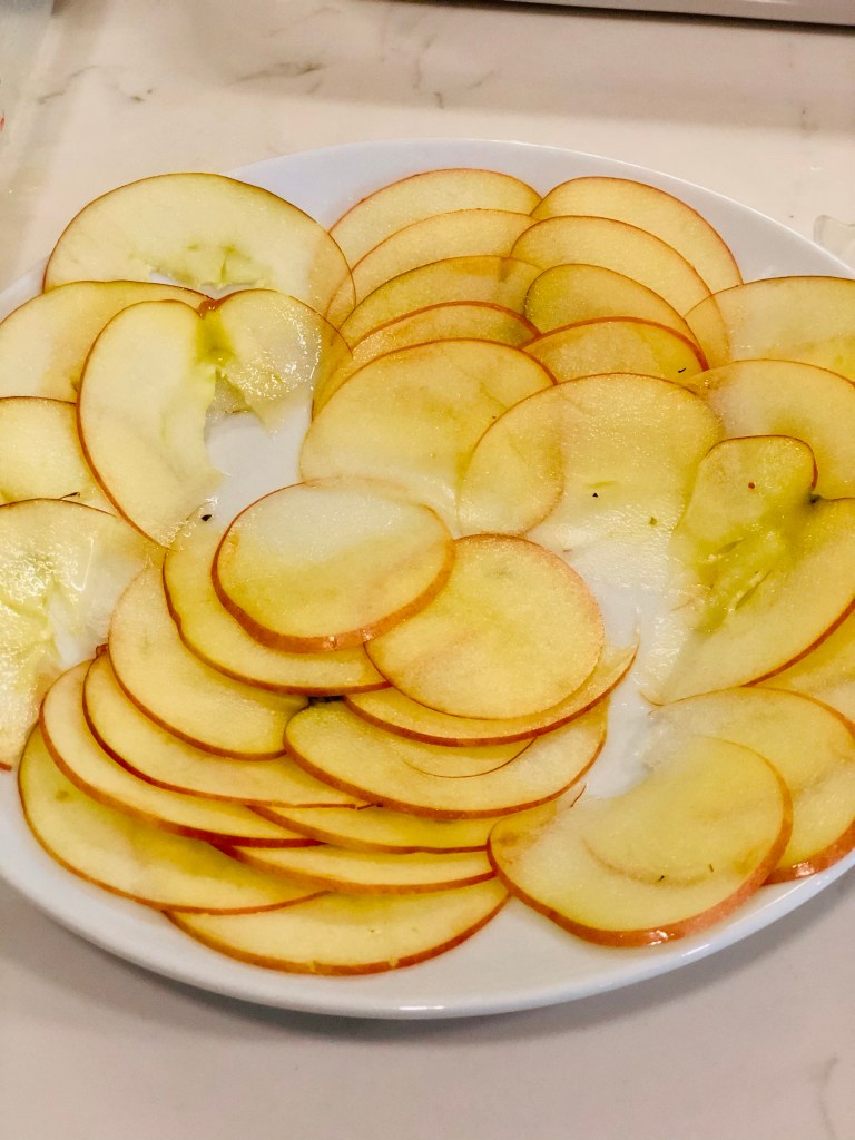 I used a mandolin to slice my apples (one per person) and then squeezed some lemon juice over the slices to keep them from turning brown.