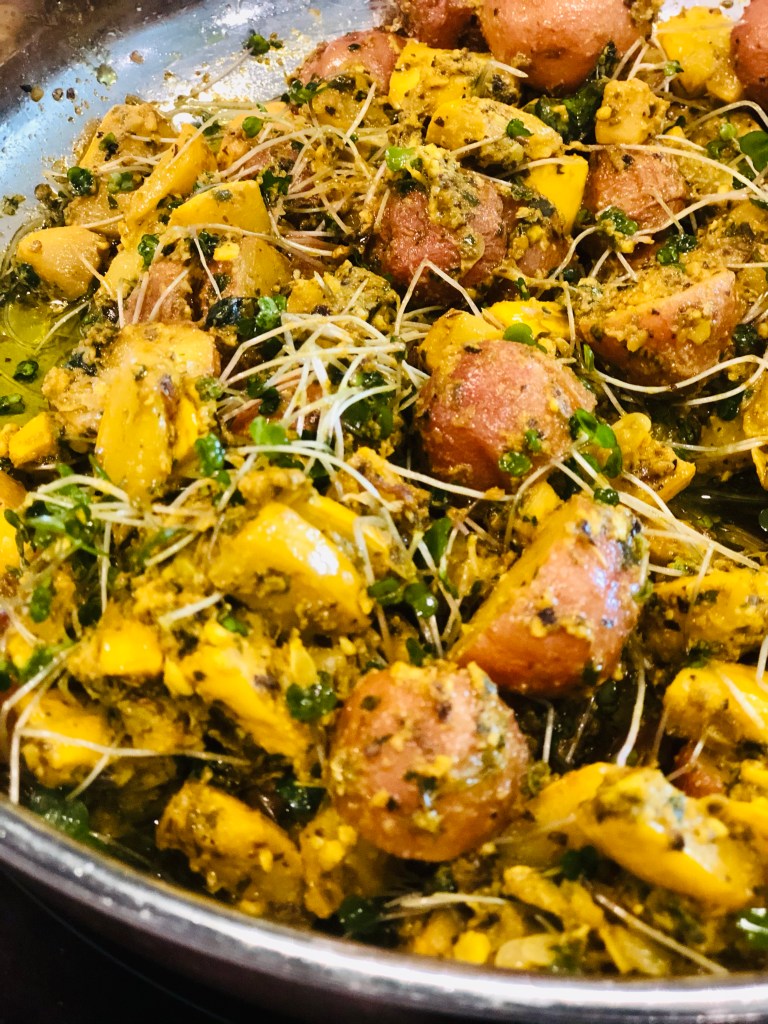When the potatoes are done steaming and the squash is done cooking, place them together with the pesto and stir, (you do not need to add all the pesto – add just enough to coat everything. The pesto will save well in the fridge) adding some fresh basil you can cut with kitchen shears or slice. Leave on low. If you cooked everything at the same time together, wait to add the pesto till the veg and potatoes are softened and done.