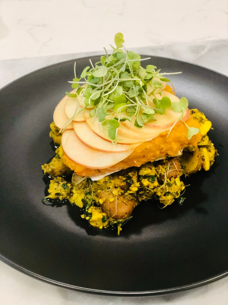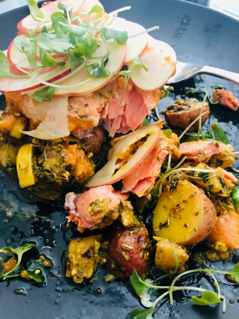 The first thing you will taste is the salmon with the apricot – the apple is the last thing and if eating a bite with the veg and potatoes, you’ll get a smoky hit from the turmeric and a creamy note from the avocado and macadamia nuts… There is SO MUCH flavor in this – I already want this again tomorrow.
