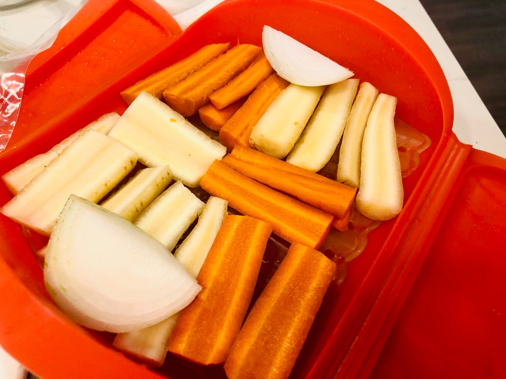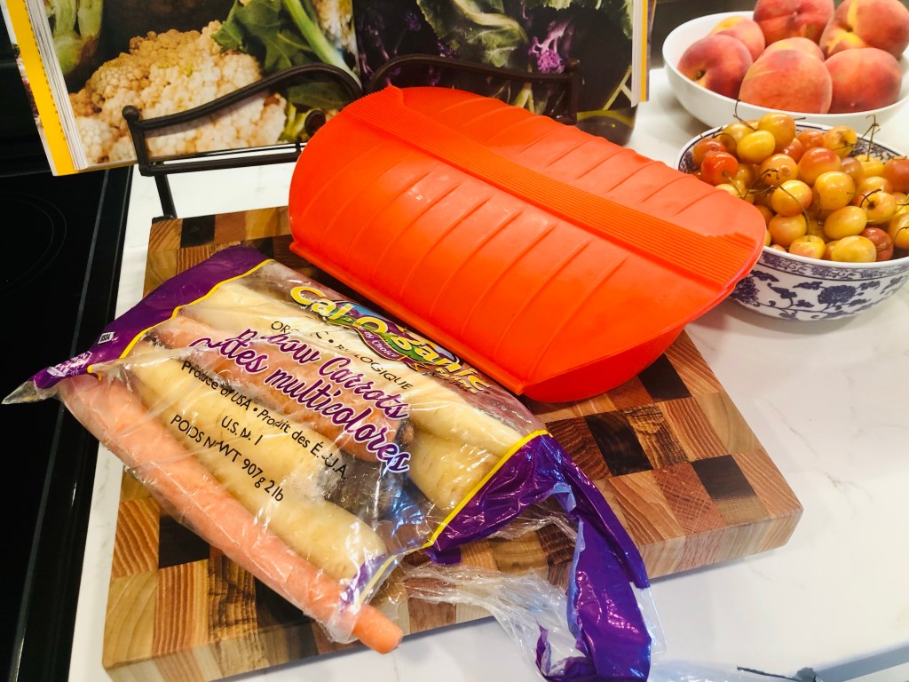 The first thing you’ll want to do is start steaming the carrots and the onion. We use the Lekue Steamer. They have them in all different sizes and prices. But choose whichever steaming method works best for you. Just make sure for each batch of this soup – which I found can serve up to three people – that you use one third of an onion and four medium sized carrots.