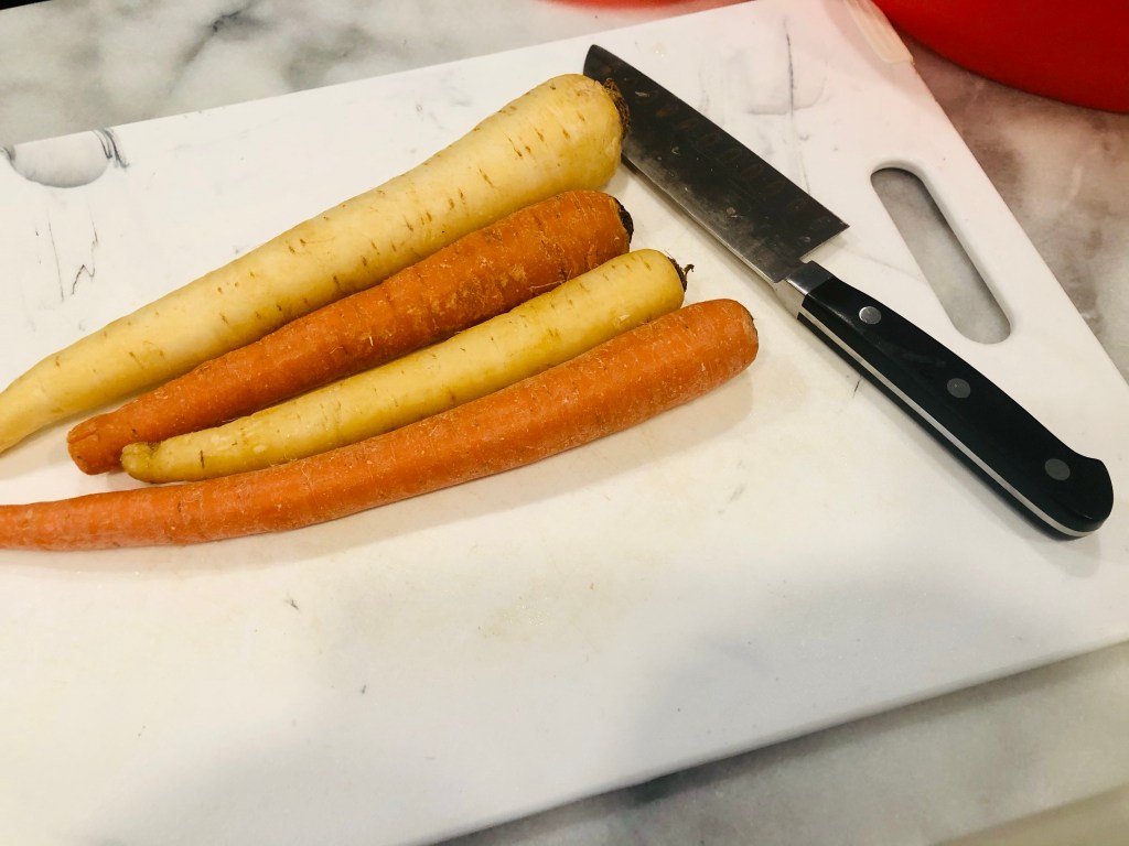See below the type of carrots I referenced above. Depending on the color you want, you can choose the carrots that way. I wanted a lighter yellow so I went with two orange and two white – most similarly in size: medium.