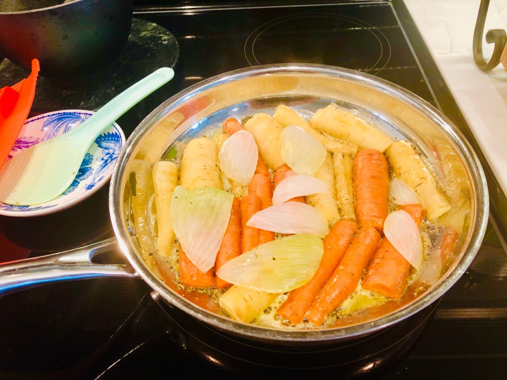 At that point, take one of the carrots and flip them over – see if they’re browned or not. If they are, go ahead and stir everything, pushing the onions further down into the pan, making sure that you flip each carrot. If they’re not yet browned, let them sauté a bit longer.