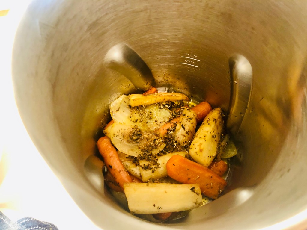 Add just filtered (or spring) water – I used the max line on the machine but if you’re using a food processor, add as much as you need to get the machine going to puree the veg, and then add it to a pot and finish adding enough water for the people you are serving. Let it combine and stay on medium / medium low. At which point you can taste it to see if you want to add additional salt.