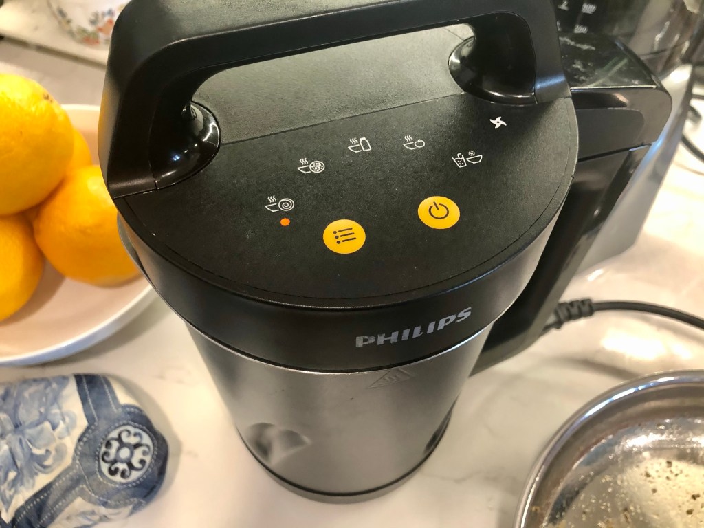 The soup maker has a few buttons on the top that lets you choose the consistency of the soup as well as the temperature, allowing you to also make smoothies or sorbet. The last button is for simple blending. I used the button that is glowing – it’s the only button I use.