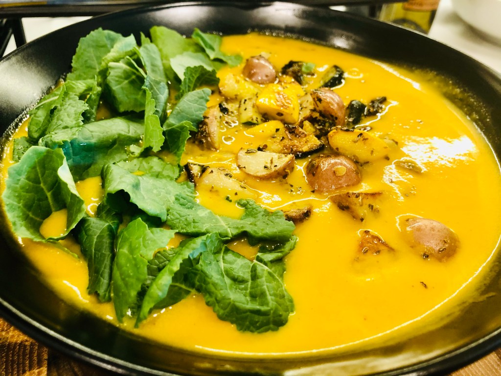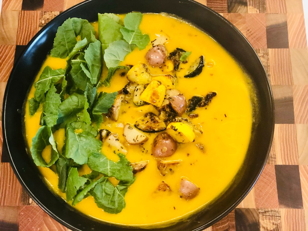 In the meantime, while your soup is finishing in either the machine or in a pot, take your original pan that should still have some oil and herbs in it that never poured out – and put in some chopped veg (this is optional but if you decide to do that, I used Zucchini, Yellow Squash and Baby Potatoes – enough for the people I was serving). Add just a bit more olive oil, coconut oil and only the oregano, basil and salt. Do not use any additional ginger as it’s a very potent spice in my opinion, and less is more with this simple soup.