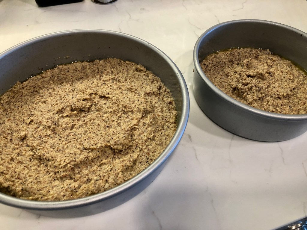 When completely blended, spray your cake pans with non-stick cooking spray and pour an equal amount in each. Please see above for size recommendations (can fill two 6” rounds completely, otherwise will make a small tiered cake).