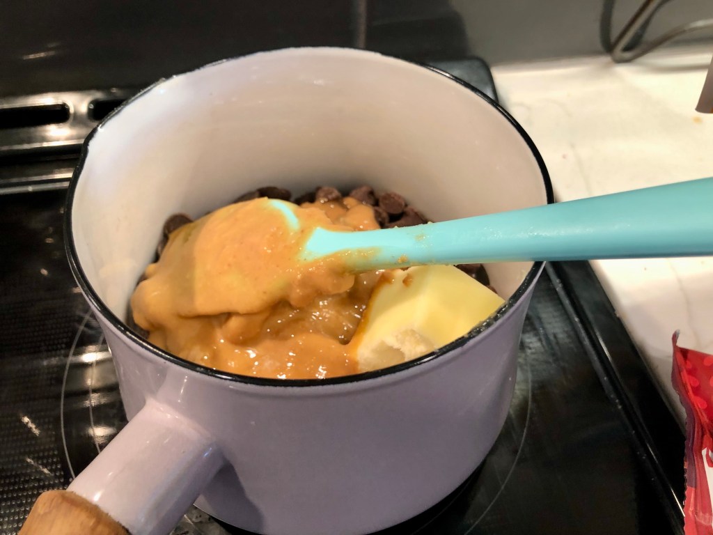In a sauce pan, pour at least one cup of the chocolate chips over medium low heat. Then add two tablespoons each of butter and the peanut butter. Stir over medium low until combined.