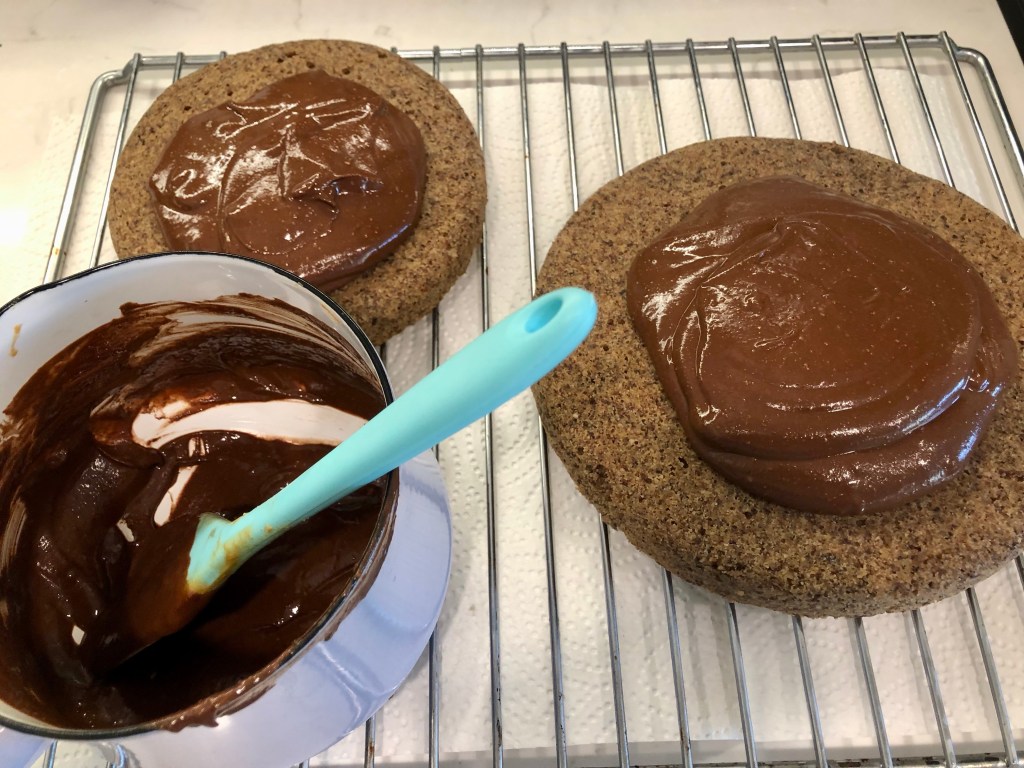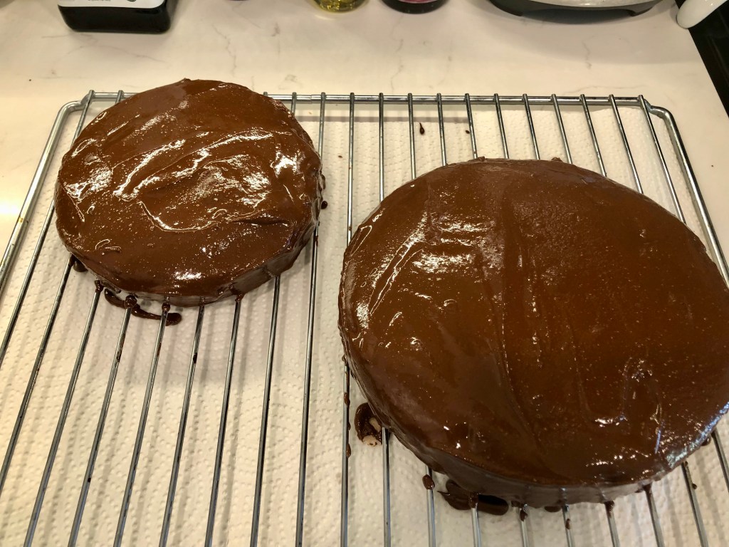 When cooled, put a paper towel under the cakes and pour the chocolate onto each round and smooth the frosting until covered. The paper towel will catch any extra drips. If you have any additional frosting left over, you can use it to dunk fruit into. We did that with the strawberries we happened to have.