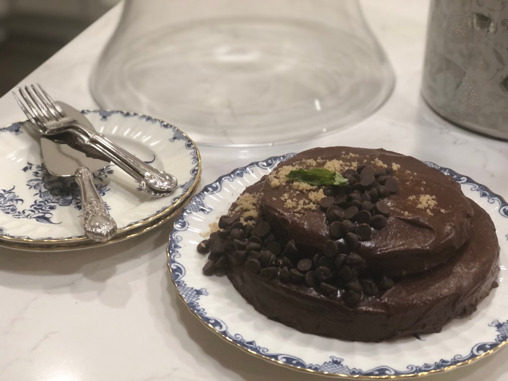 Now, let sit until everything hardens and then decide how you want to display the cake. Since it was small and for just us two, I decided to sprinkle the cake with some additional chocolate chips cascading down the side, added some PB2 (powered peanut butter) over the top (though some brown sugar or shaved coconut would have worked as well) and a fresh sprig of mint for color.
