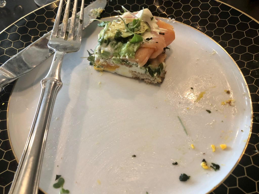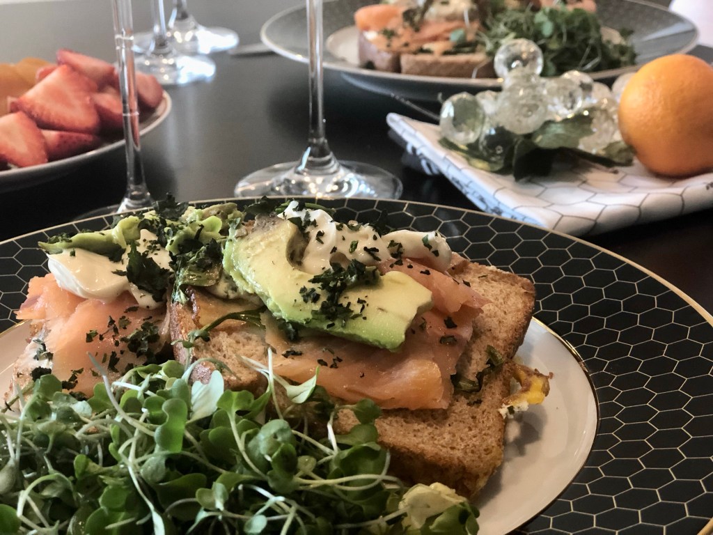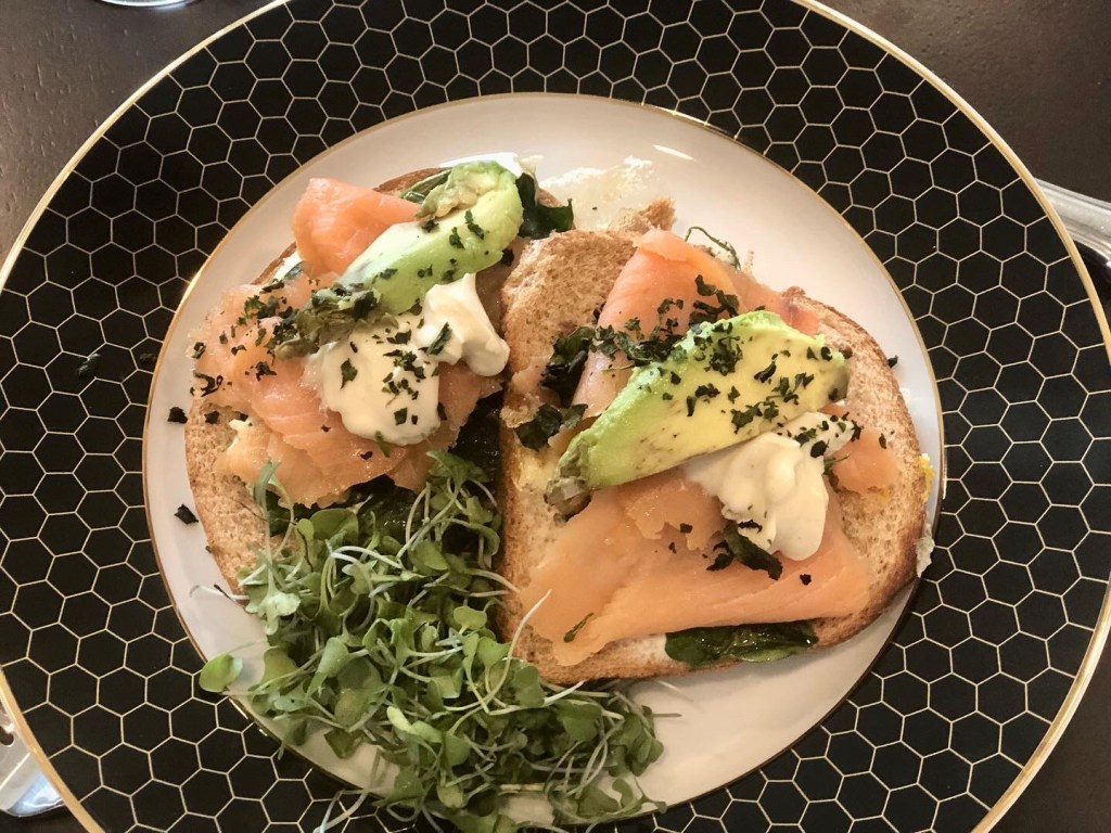 For plating, I placed two slices of stuffed bread per person, layered with the smoked salmon, then a dollop of truffle mayo along with a slice of avocado. I then topped with some of the semi-dried basil and a side of broccoli micro-greens.