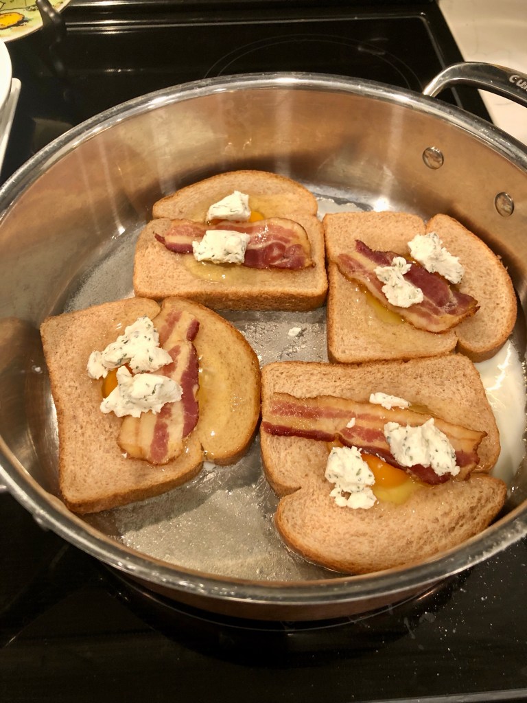 I had already cooked my bacon, so make sure you either get pre-cooked bacon or have it already cooked when you prepare this meal. Take each slice and rip in half. Place one half slice over each egg, then top the bacon with two clumps each of the goat cheese.