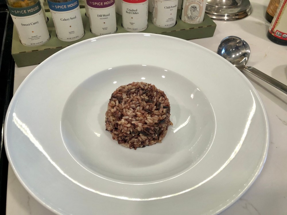 Stir and then taste. Take your same one cup measure you had used for the rice, if you’d like to present this way, and add just a little bit of water to it to coat it and allow the rice to pop out easily. Take your parsley and if dry, rinse and chop.