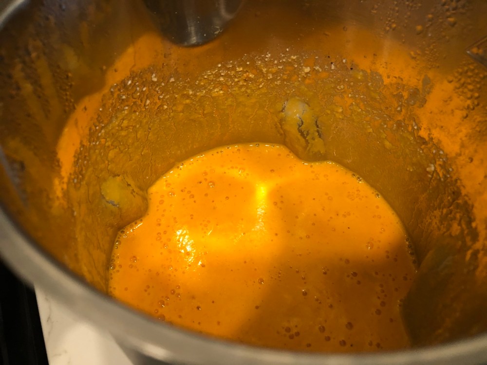 Then add your broth to the max line of the soup maker (or both boxes in the stock pot) and hit the first button for blending / pureeing. This will be done in 18 mins. If using the conventional method, go ahead and get everything to boil and simmer till softened. Blend how your normally would and then add the pepper to taste and the salt as well (more on that below).