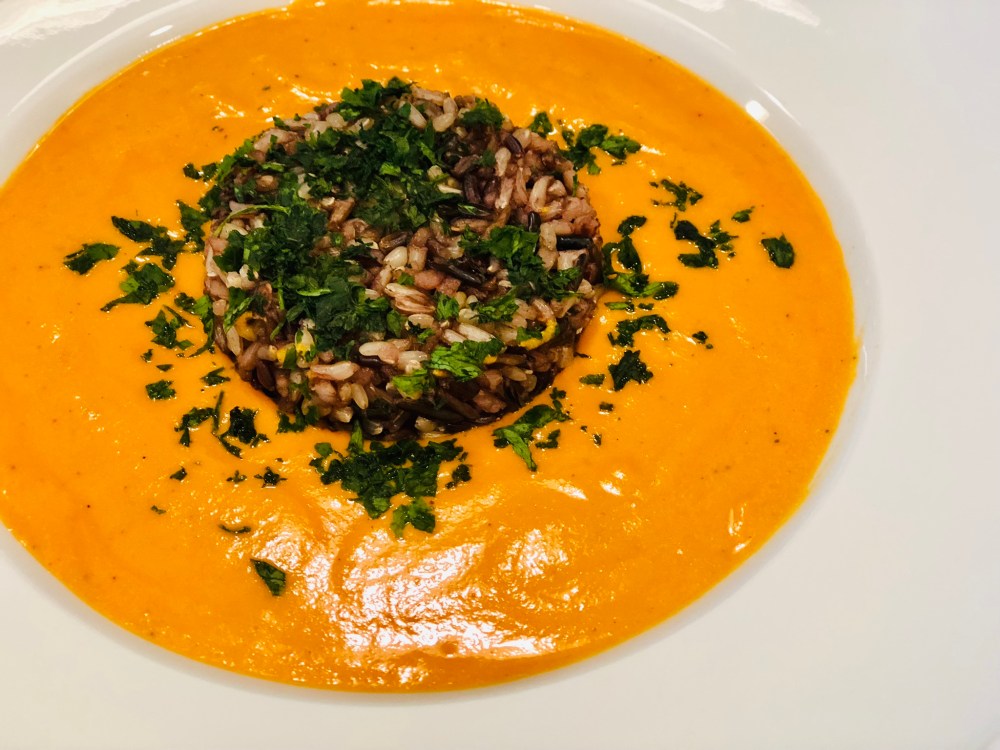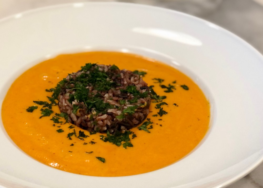 dairy free roasted red pepper & tomato soup with wild rice & parsley