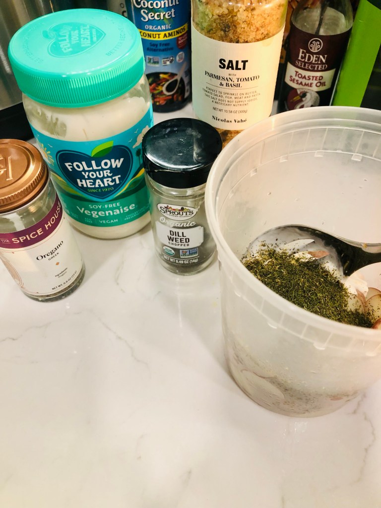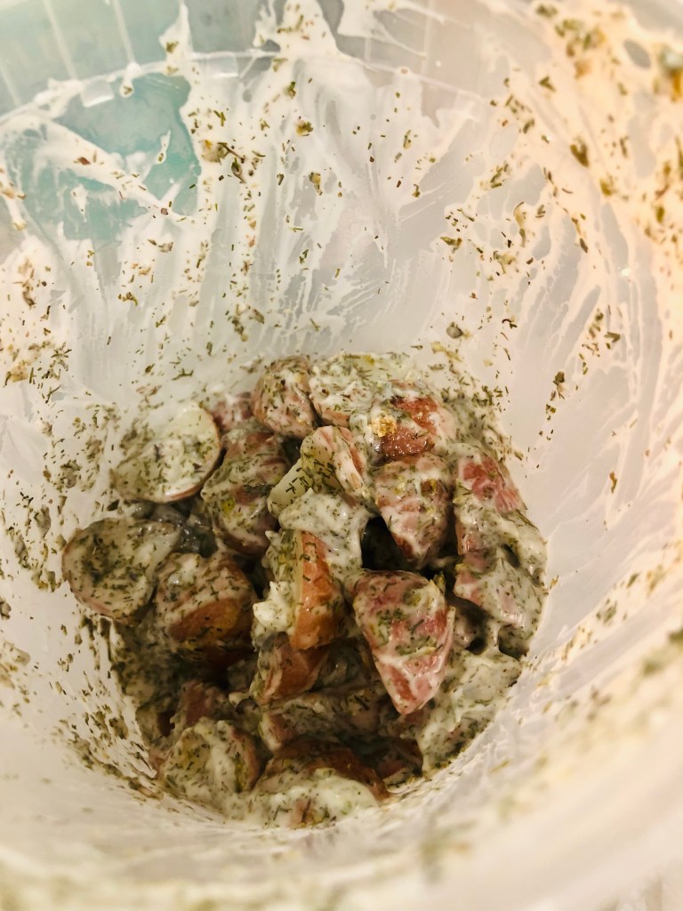 When the potatoes have steamed, put them a container / bag and use enough Veganaise to coat them entirely, adding oregano, salt and dill to taste.
