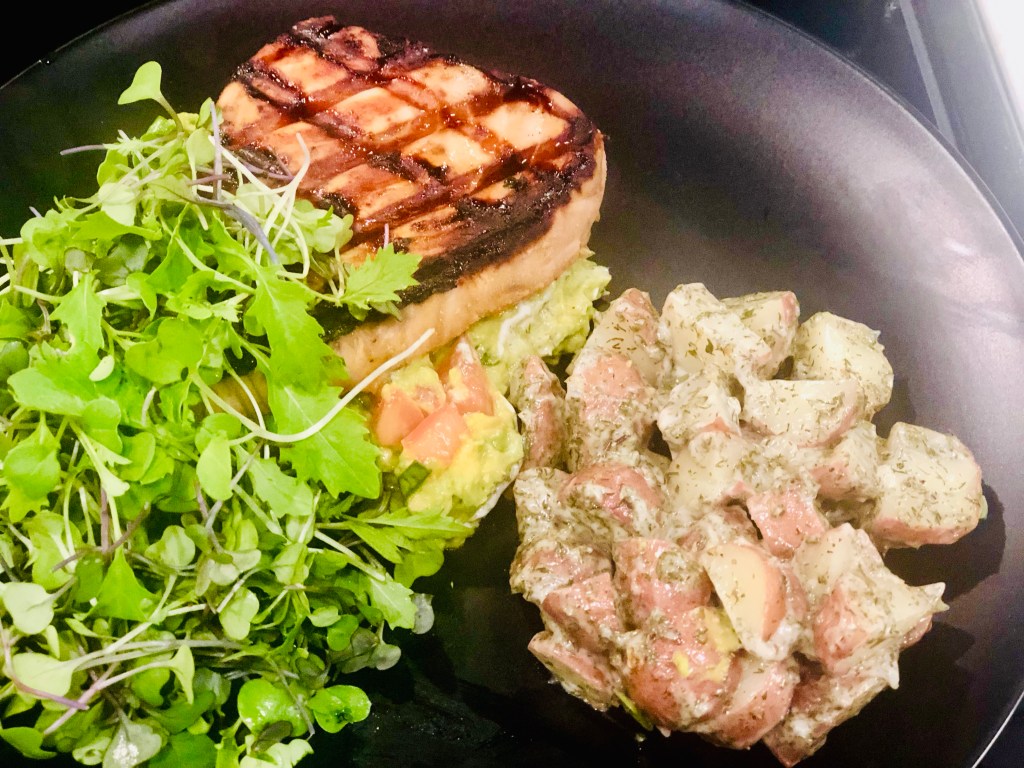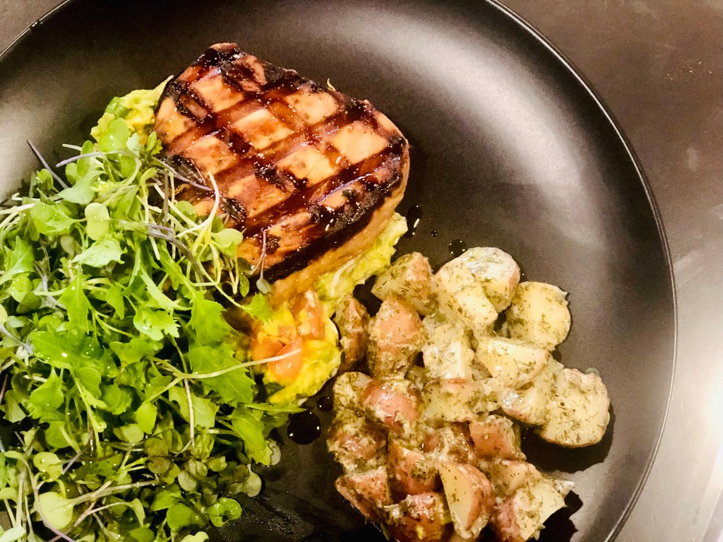 grilled coconut bbq citrus ginger tuna with baby potato salad and avocado