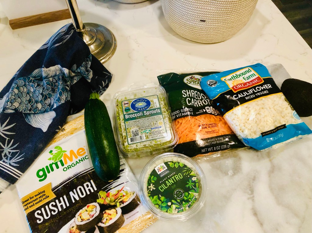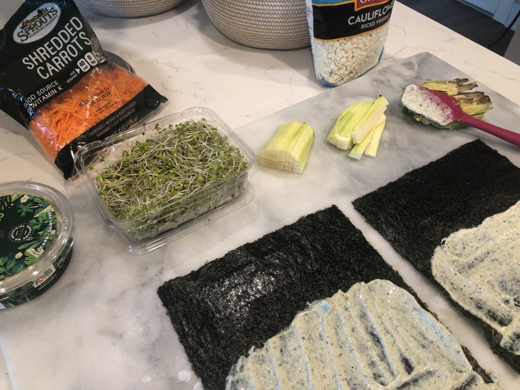 First thing you’ll want to do is chop up your zucchini into matchsticks or at least as thin and short and uniform as you can. Set half the zucchini per nori sheet aside. Cut your avocado into strips, using a quarter per nori wrap. Then lay out your nori sheets – I do two at a time. Coat them with whatever dip you chose (you can see the brand of cilantro dip we prefer and you may find it at your local Sprouts, Whole Foods, Fresh Market or Kroger) – layer the dip on the sheets first.