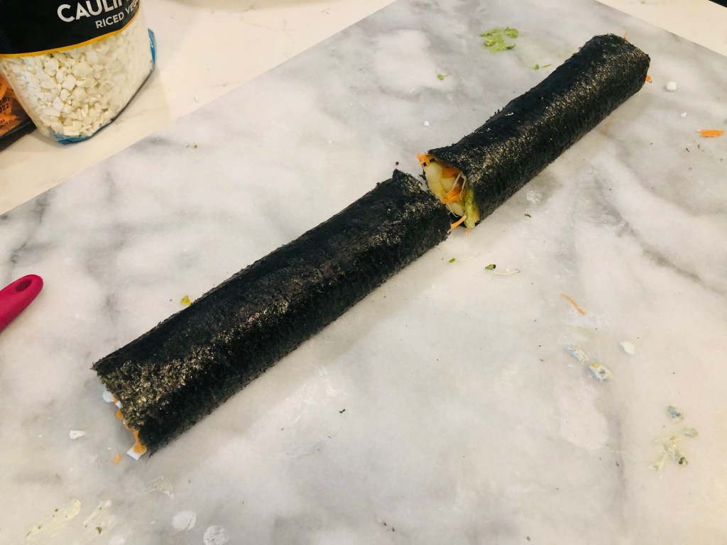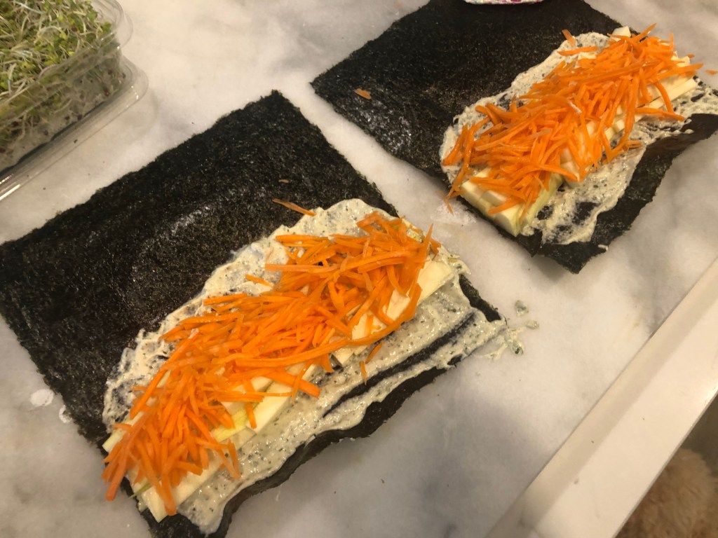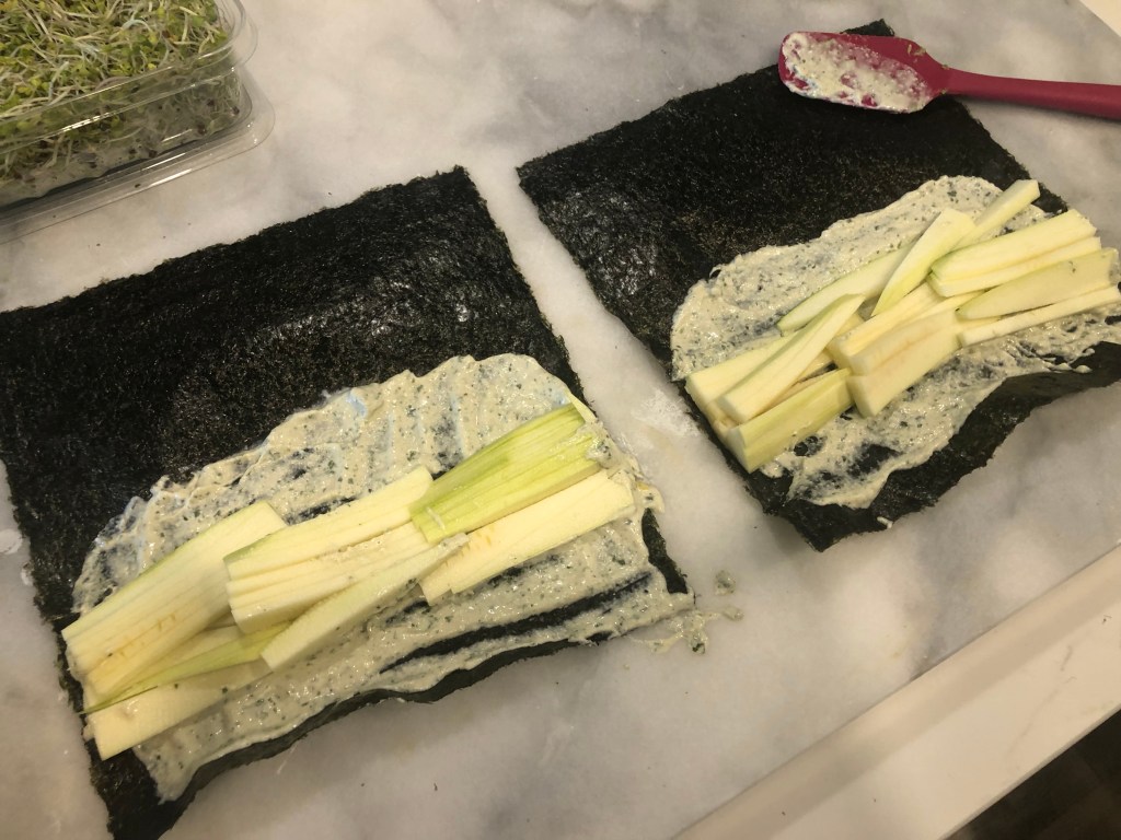 Next, lay your zucchini sticks down, making sure you space them across the nori as well as you can (doesn’t need to be perfect), remembering to have a solid amount at each end for the end pieces that you’ll be cutting.