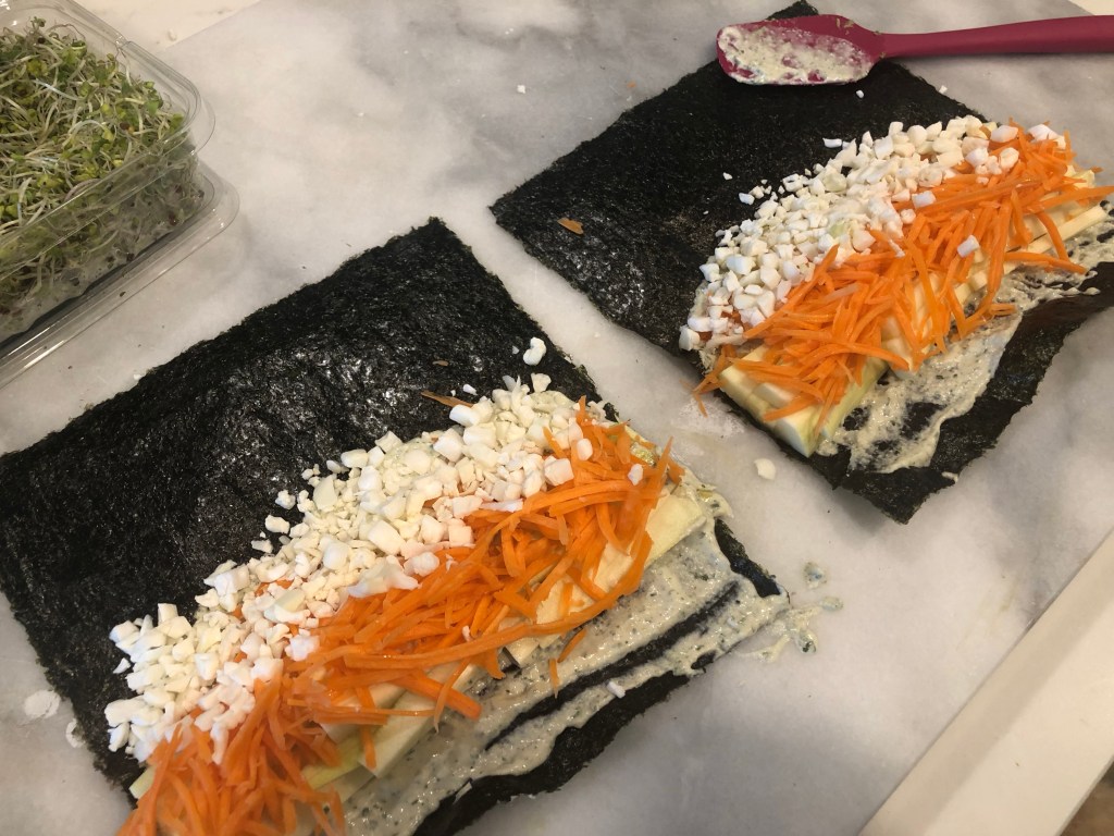 Next is the avocado. One quarter per nori roll. Again, making sure you don’t leave out the ends of the wrap when filling.