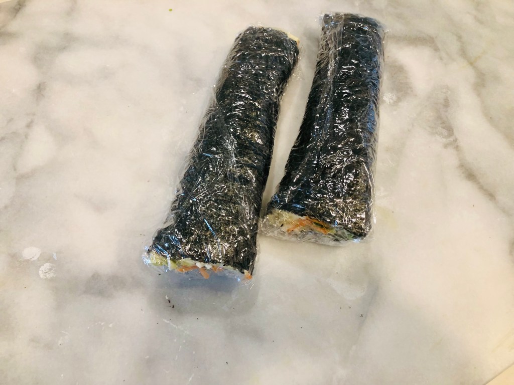 Start to roll each wrap, as tightly as you can and then leave on its closed side while you get some plastic wrap.
