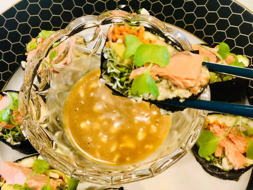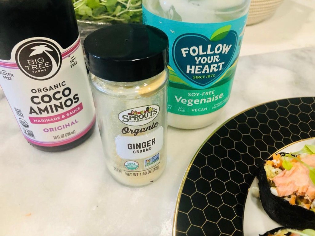 In a bowl (this measurement is for one sheet; adjust accordingly) plop two tablespoons of vegan or regular mayo, one tablespoon of coconut aminos and two teaspoons of ginger. Whisk and taste. See if per your liking, you want to add more of anything. The coconut aminos add the salt, the mayo is fantastic flavor with the salmon you’ll be adding and the ginger is a familiar taste with sushi. Any leftover sauce can be used with salmon, chicken, tuna, etc.