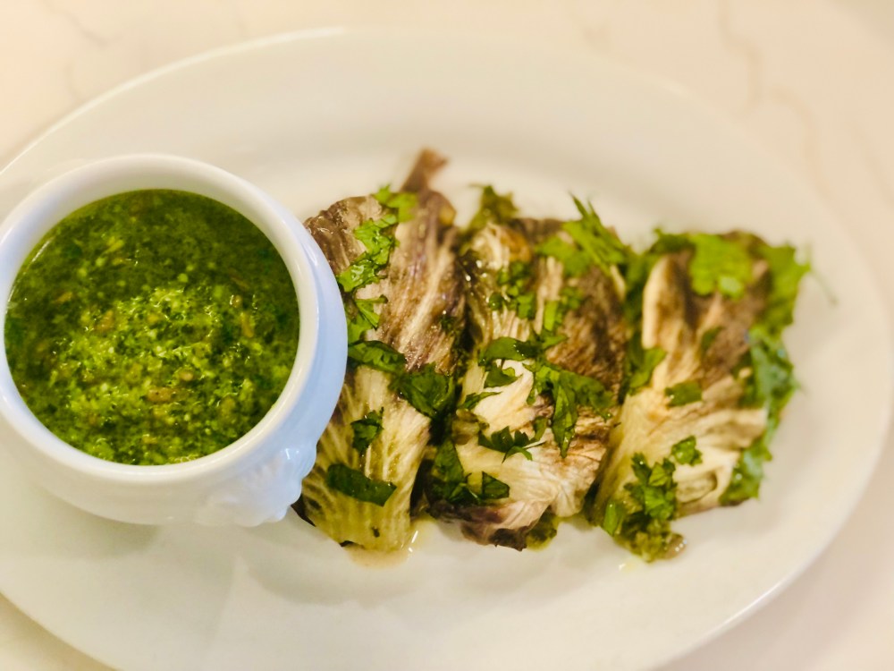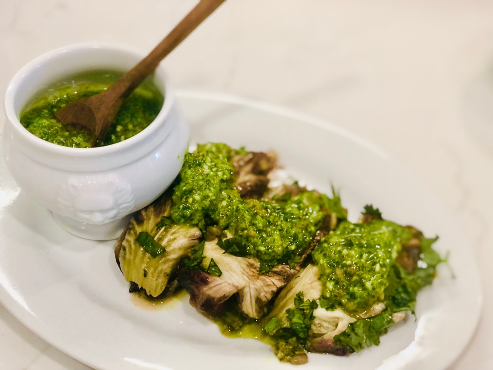 TIP: You will not be able to cut through these with a standard knife. You will need kitchen shears. After you have plated, go ahead and pre-cut the stuffed radicchio into bite-sized pieces (three pieces per stuffed leaf) and provide a spoon. That way everyone can get into the stuffing easily while also scooping some pesto.